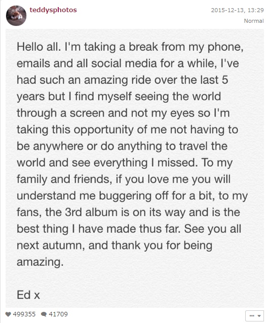 แต่ก็ไม่ใช่ว่าเขาติสต์จัด หรืออะไรหรอกนะ หนุ่ม Ed ให้เหตุผลว่า หลายปีที่ผ่านมา เขาได้รับประสบการณ์ที่ดีมากมายก็จริง แต่เขาอยากออกไปท่องเที่ยวหาประสบการณ์ใหม่ๆ ด้วยมุมมองของเขา ผ่านสายตาของเขาเอง ไม่ใช่จากหน้าจอมือถือที่เขาใช้อัพเดตเรื่องราวต่างๆ เช็คอีเมล และเล่นโซเชียลมีเดียมาตลอด 5 ปีที่ผ่านมา ดังนั้นจึงขอให้โอกาสนี้ประกาศให้ทราบโดยทั่วกันว่า เขาจะวางมือจากโลกโซเชียลทุกอย่าง พักกิจกรรมต่างๆ และออกท่องเที่ยว เปิดมุมมองใหม่ๆ ที่เขายังไม่เคยเห็น หรืออาจจะเคยมองข้ามไป เพื่อมาเป็นวัตถุดิบในการสร้างสรรค์ผลงานเพลงดีๆ ให้พวกเราฟังกันต่อไปนั่นเอง