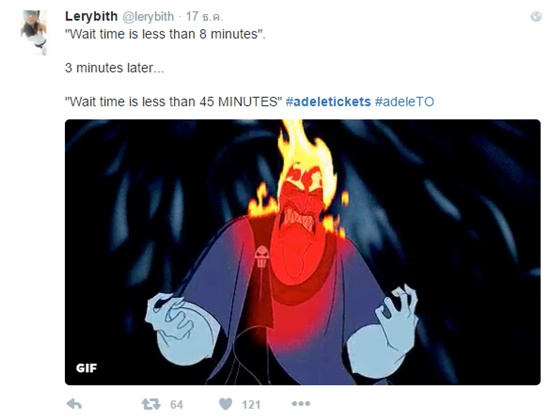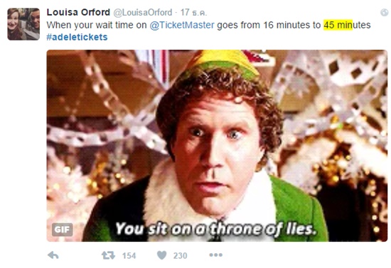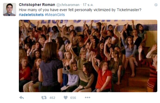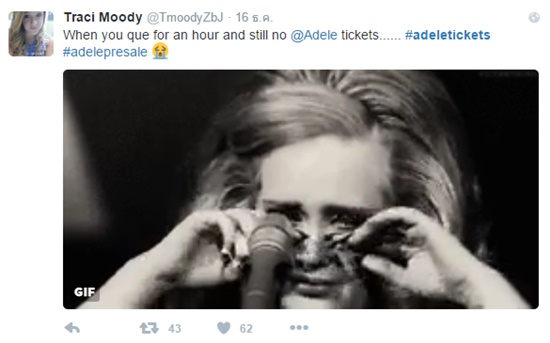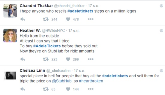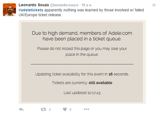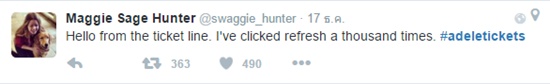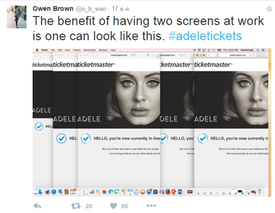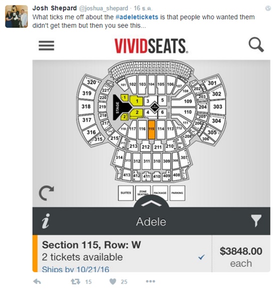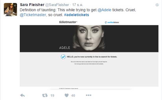 กลายเป็นประเด็นฮอตในโลกโซเชียลของอเมริกาเพียงชั่วข้ามวัน เมื่อการซื้อบัตรคอนเสิร์ตศิลปินสุดฮอตในปีนี้อย่าง Adele ทำให้แฟนเพลงหลายคนออกมาบ่นกันไม่หยุด ถึงแม้บัตรคอนเสิร์ตของสาว Adele จะไม่ได้ราคาถูก แต่แฟนเพลงพร้อมใจกันต่อคิวออนไลน์ซื้ออย่างใจจดใจจ่อ แต่สุดท้ายเมื่อเข้าสู่ระบบได้ กลับพบแต่ภาพที่เต็มหมดแล้วทุกที่นั่ง ทำเองแฟนคลับ #ร้องไห้หนักมาก ไม่ต่างจากเมื่อคราวบัตรคอนเสิร์ตของ Maroon5 ที่เปิดขายในบ้านเราในปี 2015 นี้ไม่ผิดเลยทีเดียว
