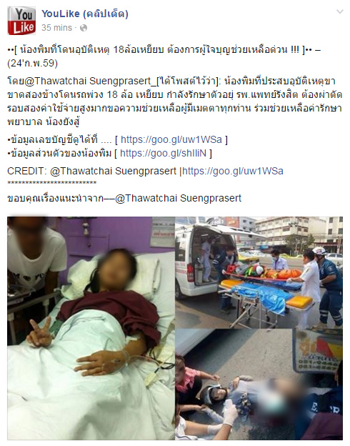 (25 ก.พ.) ผู้สื่อข่าวรายงานว่า โลกออนไลน์กำลังให้ความสนใจแชร์ที่ขอความช่วยเหลือ เกี่ยวกับกรณีเด็กนักเรียนหญิงคนหนึ่งประสบอุบัติเหตุขับรถจักรยานยนต์เสียหลักล้ม ก่อนที่รถบรรทุกสิบล้อที่ขับตามมาจะแล่นมาทับร่าง เป็นเหตุทำให้ขาทั้ง 2 ข้างขาด มีคลิปเหตุการณ์เป็นอุทาหรณ์แชร์ไปทั่ว