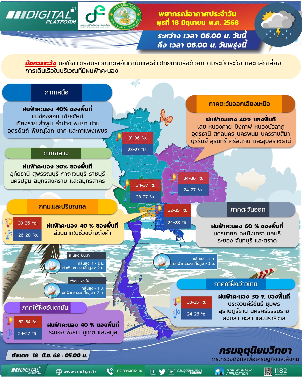 วันนี้ (18 มิ.ย.) กรมอุตุนิยมวิทยา พยากรณ์อากาศ 24 ชั่วโมงข้างหน้า ประเทศไทยยังคงมีฝนฟ้าคะนองเกิดขึ้นได้ ทั้งนี้เนื่องจากมรสุมตะวันตกเฉียงใต้พัดปกคลุมทะเลอันดามัน ประเทศไทย และอ่าวไทย