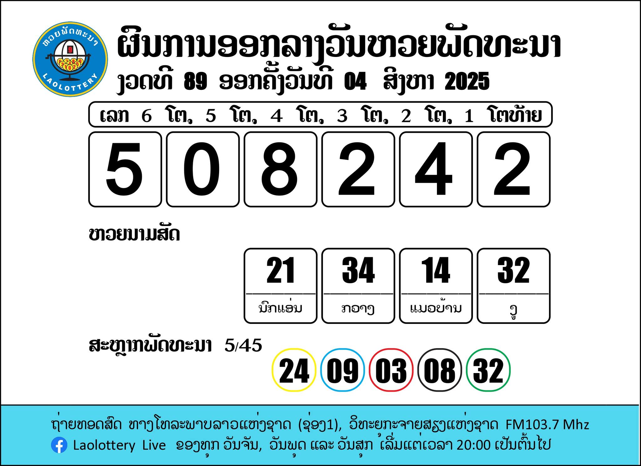 รายงานผลหวยลาว 4 สิงหาคม 2568 (4/08/68) ผลหวยลาว 6 ตัวออกรางวัลดังนี้