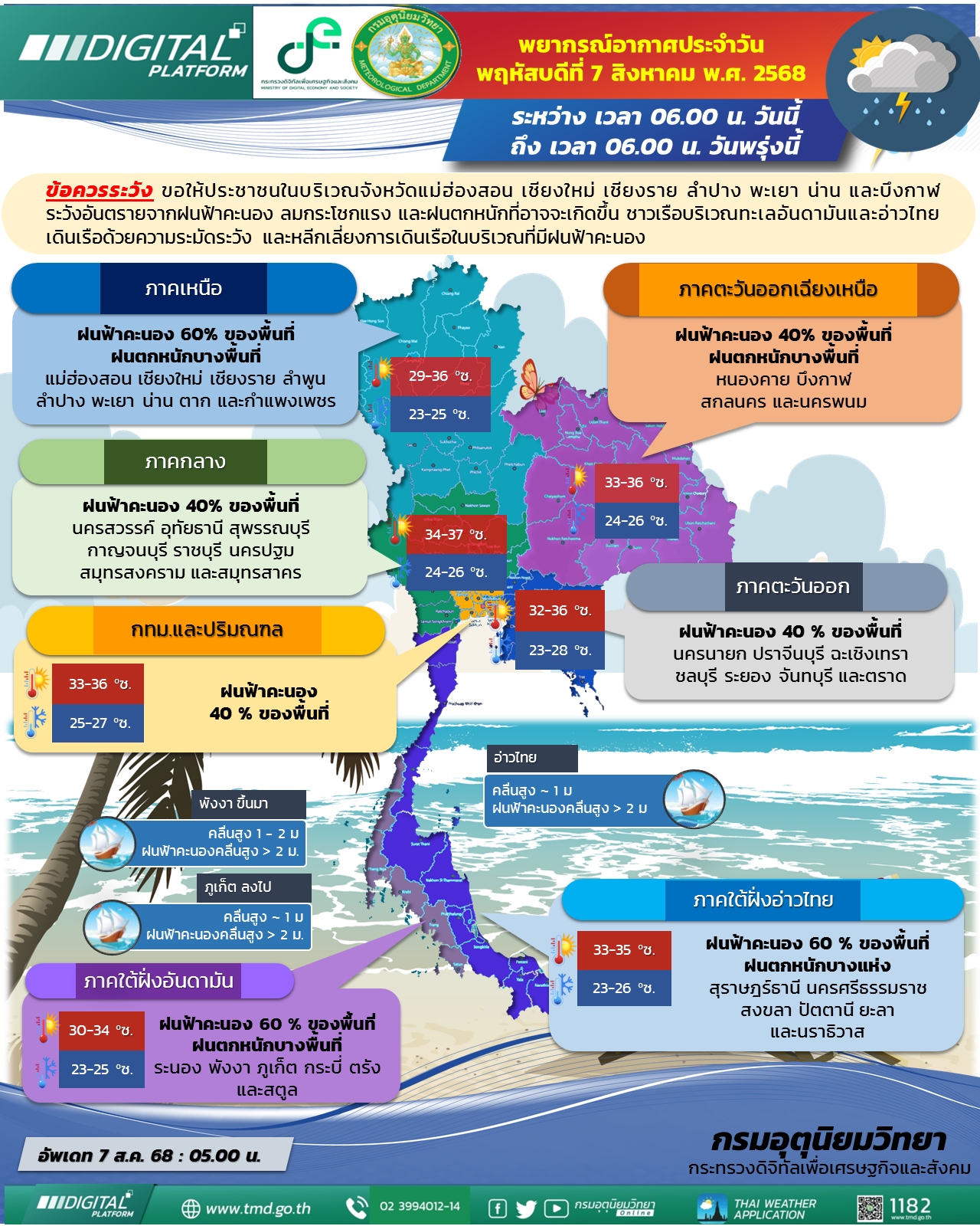 สำหรับคลื่นลมบริเวณทะเลอันดามันตอนบนมีกำลังปานกลาง โดยมีคลื่นสูง 1-2 เมตร บริเวณที่มีฝนฟ้าคะนองคลื่นสูงมากกว่า 2 เมตร ขอให้ชาวเรือบริเวณทะเลอันดามันและอ่าวไทยเดินเรือด้วยความระมัดระวัง และหลีกเลี่ยงการเดินเรือในบริเวณที่มีฝนฟ้าคะนอง