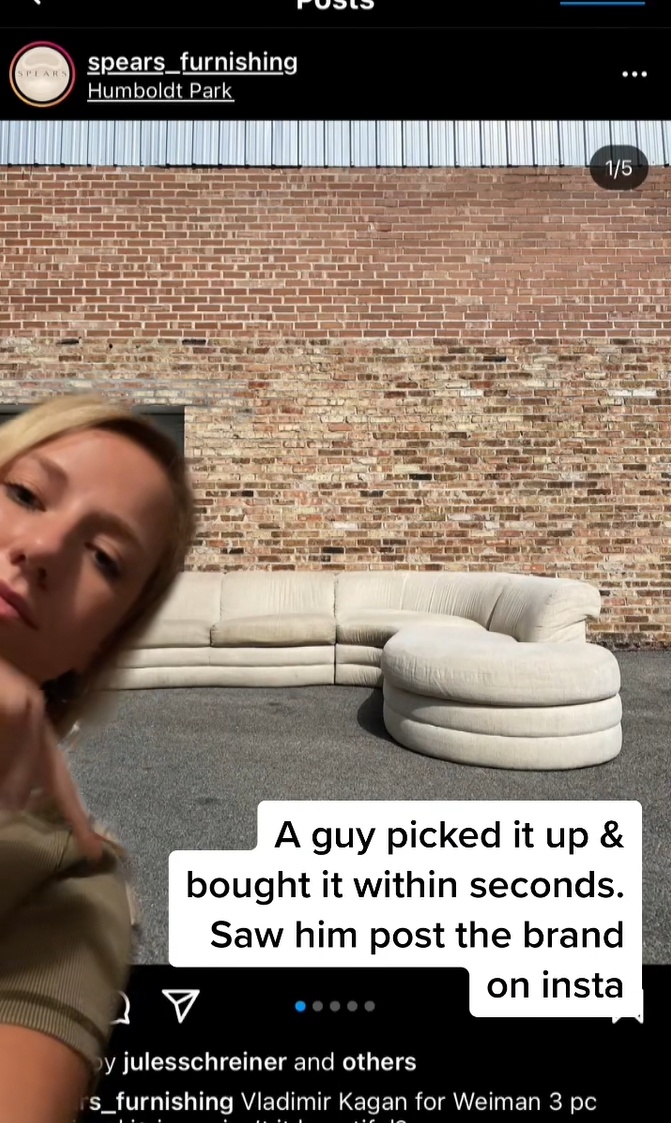 หญิงสาวชื่อ จูลส์ ชไรเนอร์ แชร์คลิปบน TikTok ซึ่งกลายเป็นไวรัล ในคลิปเธอเล่าว่า เธอโพสต์ขายโซฟาบน Facebook Marketplace และไม่นานก็มีคนซื้อไปในราคา 500 ดอลลาร์สหรัฐ (ประมาณ 16,000 บาท) ตอนแรกเธอยังคิดว่าได้กำไร แต่ภายหลังเพิ่งรู้ว่าโซฟาอาจเป็นผลงานของสุดยอดนักออกแบบเฟอร์นิเจอร์ชาวอเมริกัน วลาดิมีร์ คาแกน (Vladimir Kagan)
