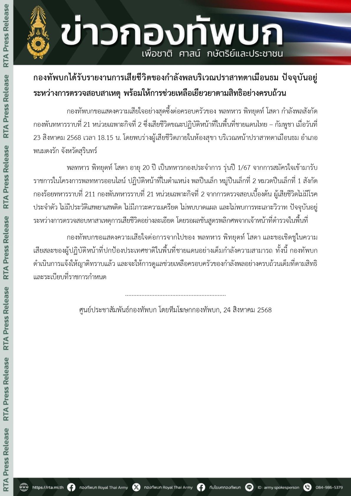 กองทัพบกขอแสดงความเสียใจอย่างสุดซึ้งต่อครอบครัวของ พลทหาร พิทยุตท์ โสดา กำลังพลสังกัด กองพันทหารราบที่ 21 หน่วยเฉพาะกิจที่ 2 ซึ่งเสียชีวิตขณะปฏิบัติหน้าที่ในพื้นที่ชายแดนไทย – กัมพูชา เมื่อวันที่ 23 สิงหาคม 2568 เวลา 18.15 น. โดยพบร่างผู้เสียชีวิตภายในห้องสุขา บริเวณหน้าปราสาทตาเมือนธม อำเภอพนมดงรัก จังหวัดสุรินทร์