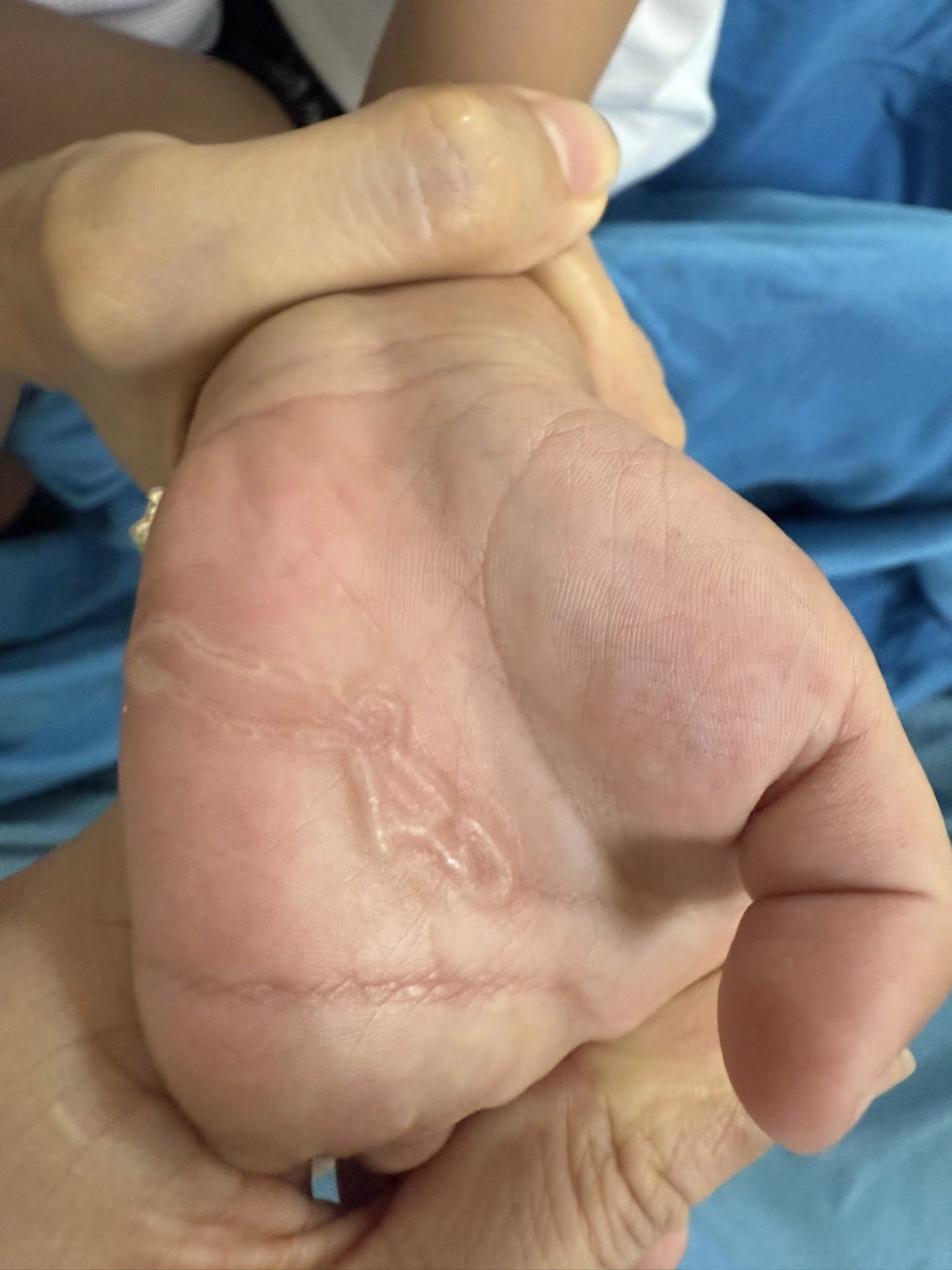 ครอบครัวเล่าว่า ก่อนเข้ารับการรักษาไม่กี่วัน เด็กเล่นกองทรายและเกิดแผลถลอกเล็กน้อยที่ซอกนิ้วมือ แต่เพียงไม่กี่วันต่อมา ฝ่ามือกลับมีรอยเส้นคดเคี้ยวปรากฏขึ้นชัดเจน