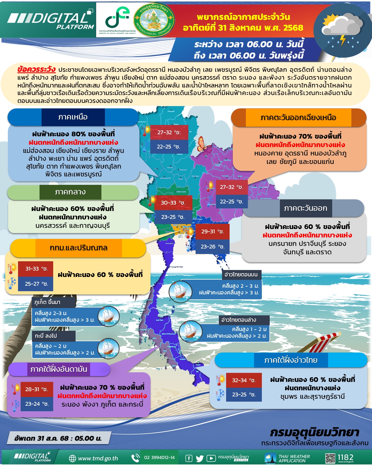 วันนี้ (31 ส.ค.) กรมอุตุนิยมวิทยา พยากรณ์อากาศ 24 ชั่วโมงข้างหน้า ประเทศไทยมีฝนตกหนักบางแห่ง โดยมีฝนตกหนักมากบางพื้นที่ กับมีลมแรง ในภาคเหนือ ภาคตะวันออกเฉียงเหนือ ภาคตะวันออก และภาคใต้ฝั่งตะวันตก