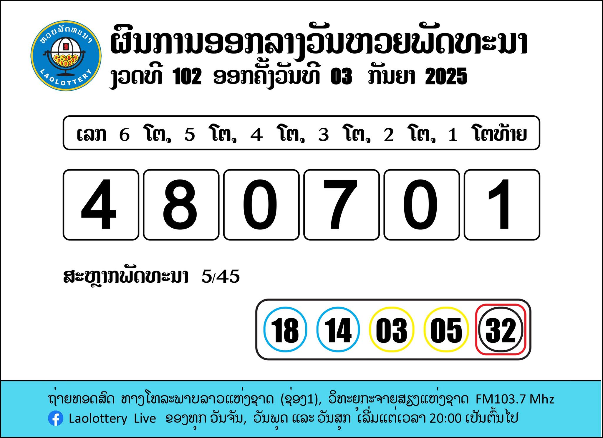รายงานผลหวยลาว 3 กันยายน 2568 (3/09/68) ผลหวยลาว 6 ตัวออกรางวัลดังนี้