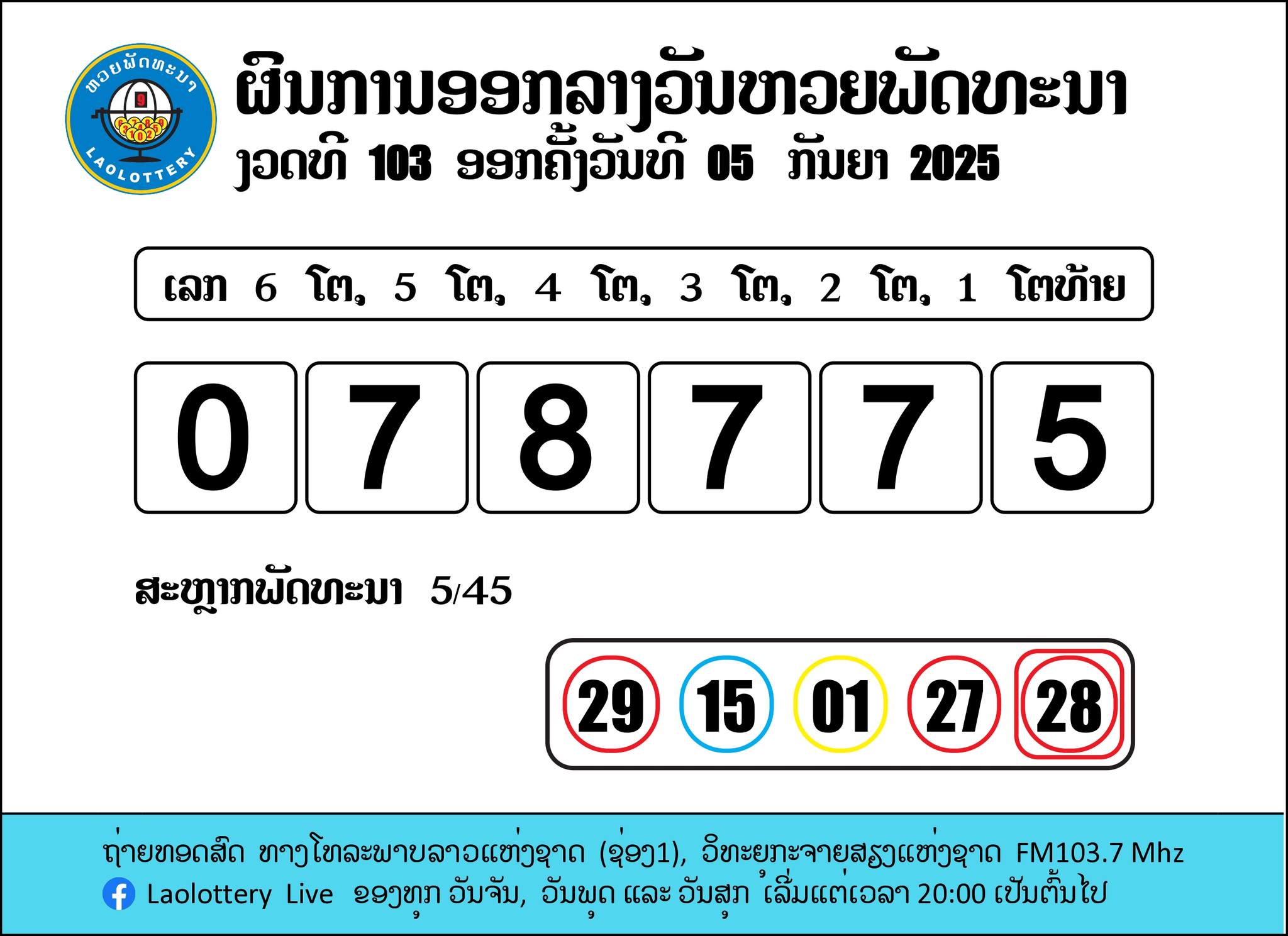 ลุ้นผล หวยลาววันนี้ 05/09/68 ถ่ายทอดสดหวยลาว หวยลาวล่าสุด หวยลาวพัฒนา 5 กันยายน 2568 หวยลาวย้อนหลัง หวยลาว 6 ตัว วันนี้ออกอะไร งวด 5 กันยายน 2568 Laolottery หวยลาว ออกรางวัลทุก วันจันทร์ วันพุธ และ วันศุกร์