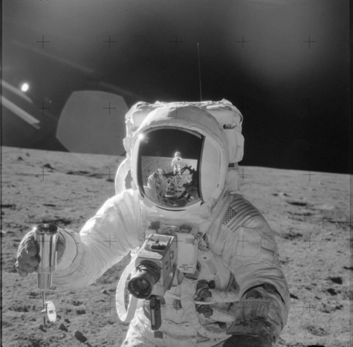 ภาพนิ่งที่ถ่ายให้เห็นขณะนักบินอวกาศลงจอดบนดวงจันทร์ ในภาพเหล่านักบินอวกาศคือ บัซซ์ อัลดริน ชายคนที่สองที่เหยียบดวงจันทร์ รองจาก นีล อาร์มสตรอง เพียงไม่นาน และคนที่อยู่เบื้องหลังเลนส์ก็ไม่ใช่ใครอื่นนอกจาก “นีล อาร์มสตรอง” เขาใช้กล้องฟิล์ม Hasselblad 70 มม. บันทึกภาพช่วงเวลาเหล่านี้
