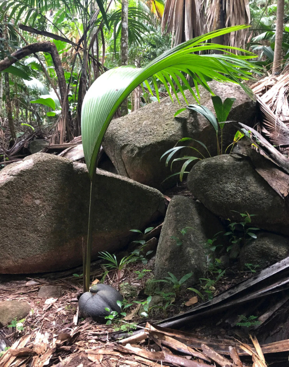 ต่างจากพืชทั่วไปที่พยายามกระจายเมล็ดให้ไกลจากต้นแม่ แต่ coco de mer กลับทิ้งเมล็ดไว้ใกล้ลำต้น เนื่องจาก ดินบริเวณนั้นมีสารอาหารสูง จากการไหลของน้ำและอินทรียวัตถุ ทำให้ต้นอ่อนมีโอกาสรอดชีวิตสูงกว่า นักพฤกษศาสตร์ยืนยันว่า ยังไม่พบพืชชนิดอื่นที่แสดงพฤติกรรมดูแลลูกต้นไม้แบบนี้