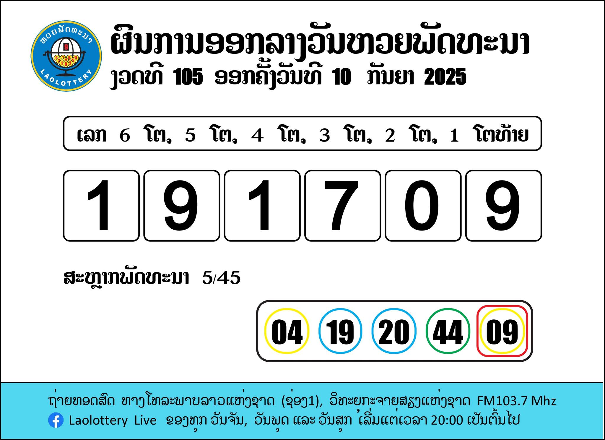 รายงานผลหวยลาว 10 กันยายน 2568 (10/09/68) ผลหวยลาว 6 ตัวออกรางวัลดังนี้