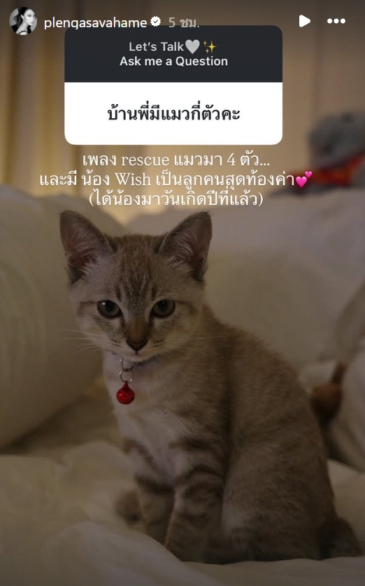 และเธอได้ตอบคำถามนี้ว่า "เพลง rescue แมวมา 4 ตัว และมีน้อง Wish เป็นลูกคนสุดท้อง (ได้น้องมาในวันเกิดปีที่แล้ว)