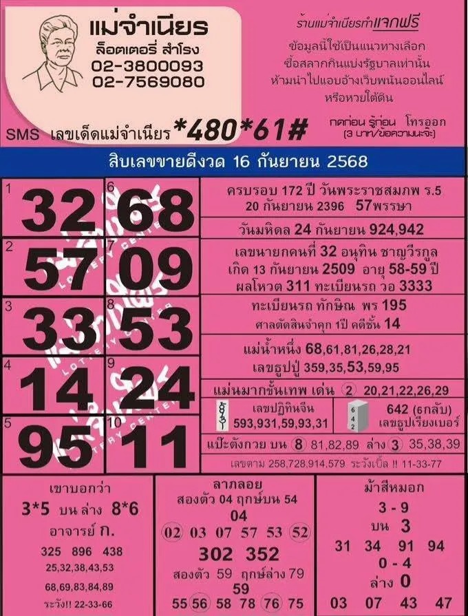 10 อันดับเลขขายดีงวด 16 กันยายน 2568 เลขเด็ด "หวยแม่จำเนียร" งวด 16/9/68