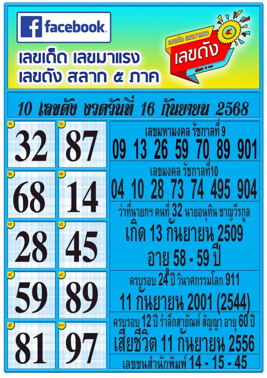 รวม 10 เลขขายดี งวด 16 กันยายน 2568 จากผู้ค้าสลาก 5 ภาค เลขเด็ด 16/9/68