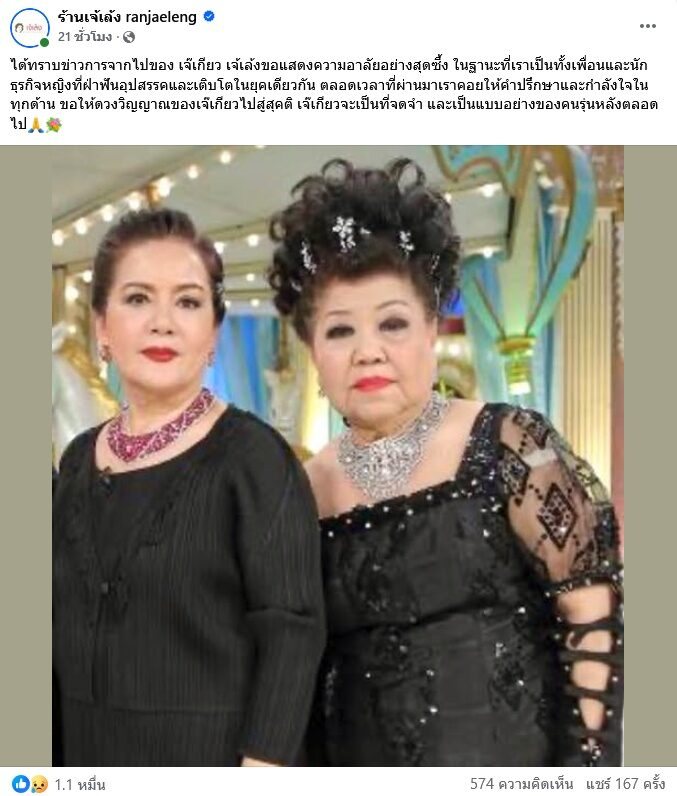 ด้าน “เจ้เล้ง ดอนเมือง” หรือ อารยา ลาภชีวะสิทธิฉัตร เจ้าของอาณาจักรค้าปลีกย่านดอนเมือง ซึ่งเป็นทั้งเพื่อนสนิทและนักธุรกิจหญิงในยุคเดียวกัน ได้โพสต์ข้อความอาลัยผ่านเฟซบุ๊กส่วนตัว พร้อมเผยภาพคู่กับเจ๊เกียว โดยระบุว่า