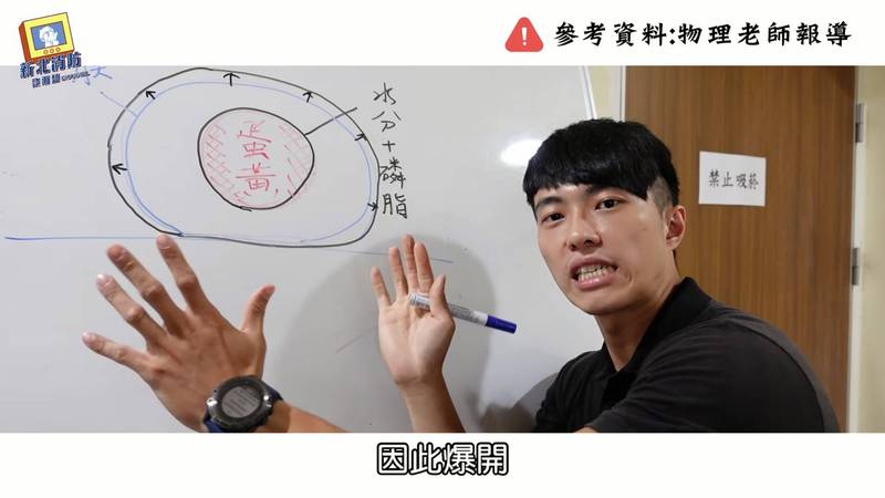 กองดับเพลิงนครนิวไทเป เผยแพร่คลิปสาธิตทางช่อง YouTube อย่างเป็นทางการ “新北消防發爾麵” โดยแสดงให้เห็นว่า หากนำขนมเปี๊ยะไส้ไข่เค็มทั้งชิ้นเข้าไมโครเวฟ เมื่ออุณหภูมิภายในเตาเพิ่มสูงขึ้น ขนมจะระเบิดออกทันที นักผจญเพลิงอธิบายว่า ไข่แดงมีทั้งน้ำและฟอสโฟลิพิด (Phospholipid) หรือ สารประกอบไขมัน เมื่อนำไปอุ่นน้ำจะขยายตัว ฟอสโฟลิพิดช่วยเร่งการกระจายพลังงาน แต่เพราะเปลือกหุ้มด้านนอกปิดกั้น แรงดันจึงไม่สามารถระบายออก จนสุดท้ายเกิดการระเบิด