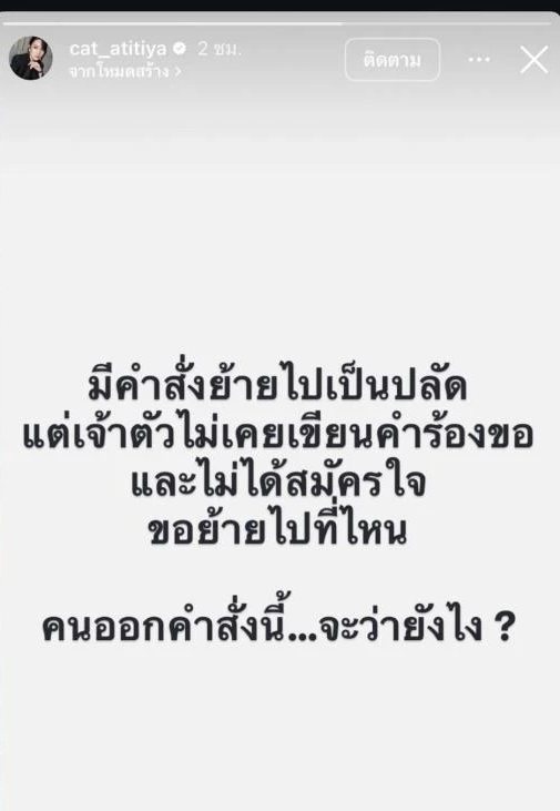 ก่อนยื่นหนังสือ ผู้กองแคทโพสต์ข้อความผ่านโซเชียลมีเดียระบุใจความว่า “มีคำสั่งย้ายไปเป็นปลัด แต่เจ้าตัวไม่เคยเห็นคำร้องขอและไม่ได้สมัครใจขอย้ายไปที่ไหน คนออกคำสั่งนี้…จะว่ายังไง?” ซึ่งข้อความดังกล่าวกลายเป็นประเด็นวิพากษ์วิจารณ์ในโลกออนไลน์และถูกนำไปตั้งคำถามถึงกระบวนการแต่งตั้งและความโปร่งใสในการโยกย้ายข้าราชการ