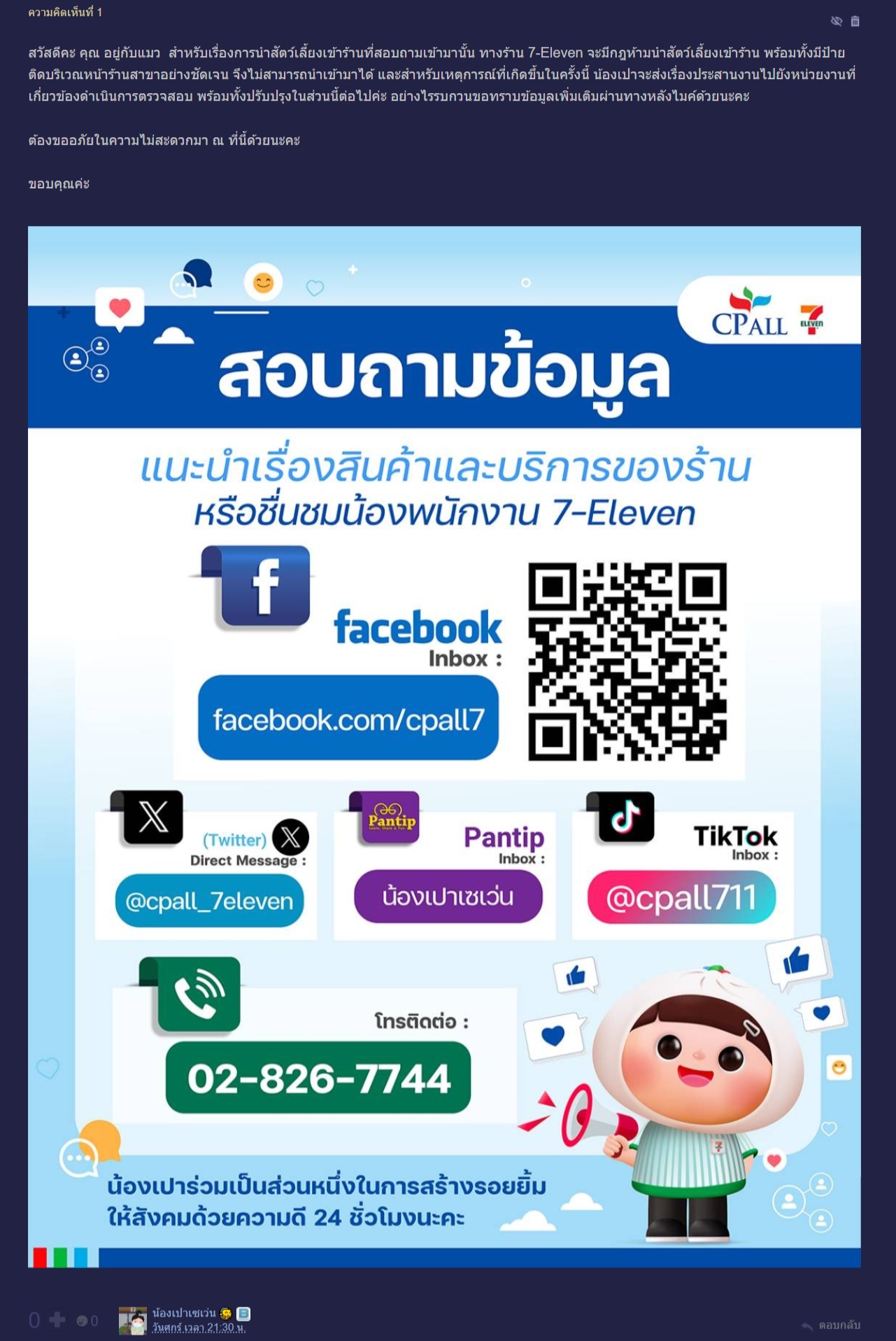 ด้าน น้องเปาเซเว่น ซึ่งเป็นแอคเคานต์ของเซเว่นฯ ได้เข้ามาตอบว่า "สำหรับเรื่องการนำสัตว์เลี้ยงเข้าร้านที่สอบถามเข้ามานั้น ทางร้าน 7-Eleven จะมีกฎห้ามนำสัตว์เลี้ยงเข้าร้าน พร้อมทั้งมีป้ายติดบริเวณหน้าร้านสาขาอย่างชัดเจน จึงไม่สามารถนำเข้ามาได้