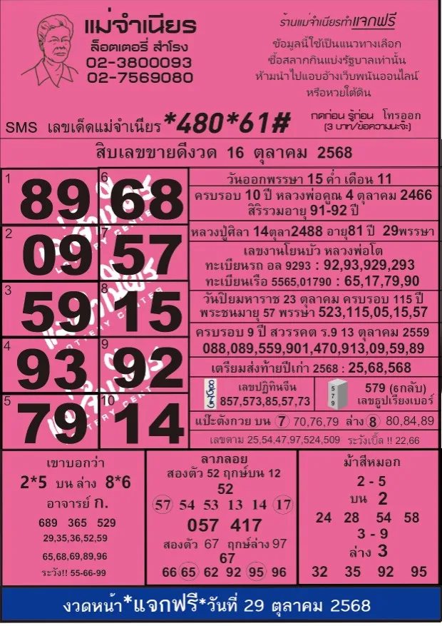 10 อันดับเลขขายดี “หวยแม่จำเนียร” งวด 16 ต.ค. 2568 มาแล้ว! คอหวยห้ามพลาด