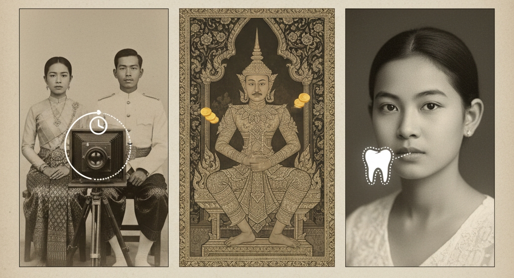ยุคก่อนระบบทันตกรรมยังไม่ทันสมัย คนส่วนใหญ่มีปัญหาฟันผุ ฟันหลอ หรือฟันเปลี่ยนสี การยิ้มเผยฟันจึงไม่ใช่สิ่งน่าภูมิใจ หลายคนจึงตั้งใจไม่ยิ้มเพื่อหลีกเลี่ยงการแสดงฟันในภาพ