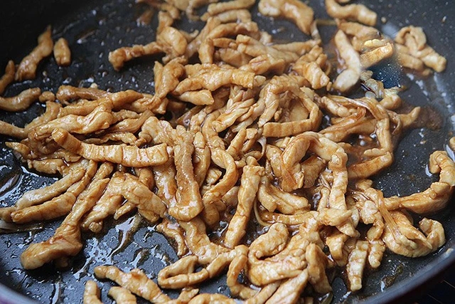 - หั่นเนื้อเป็นเส้นยาว 6 ซม. ตามขวางเส้นใย