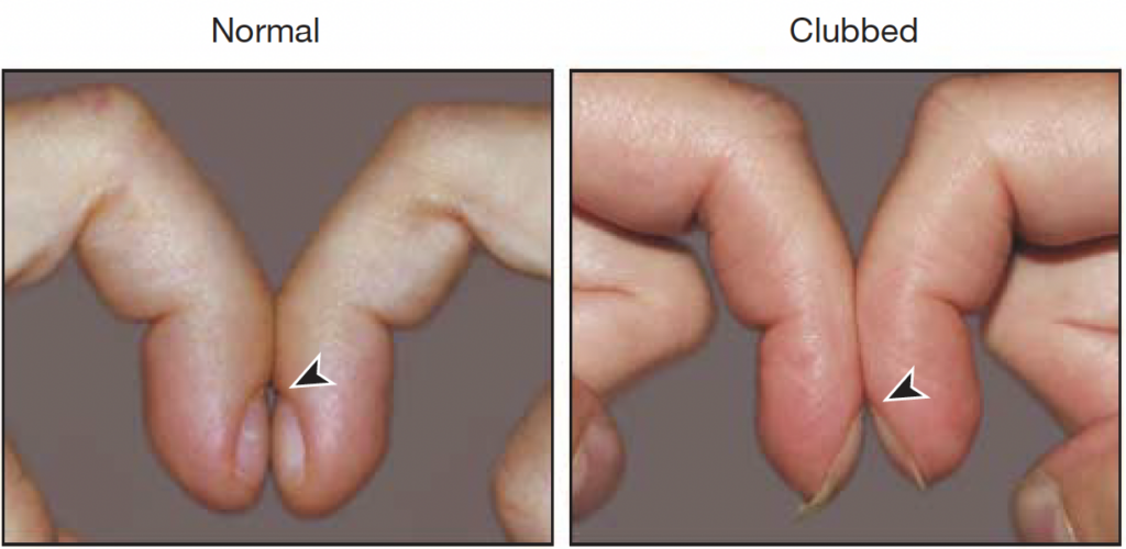 ข้อมูลจาก Cancer Research UK ระบุว่า ประมาณ 35% ของผู้ป่วยมะเร็งปอดมีอาการนี้ โดยลักษณะนิ้วจะบวม ปลายนิ้วหนา ผิวรอบเล็บมันเงา และเล็บโค้งผิดรูป ทั้งนี้ อาการเกิดจากระดับออกซิเจนในเลือดลดลง ทำให้ร่างกายหลั่งโปรตีน VEGF กระตุ้นให้หลอดเลือดและเนื้อเยื่อบริเวณปลายนิ้วขยายตัว