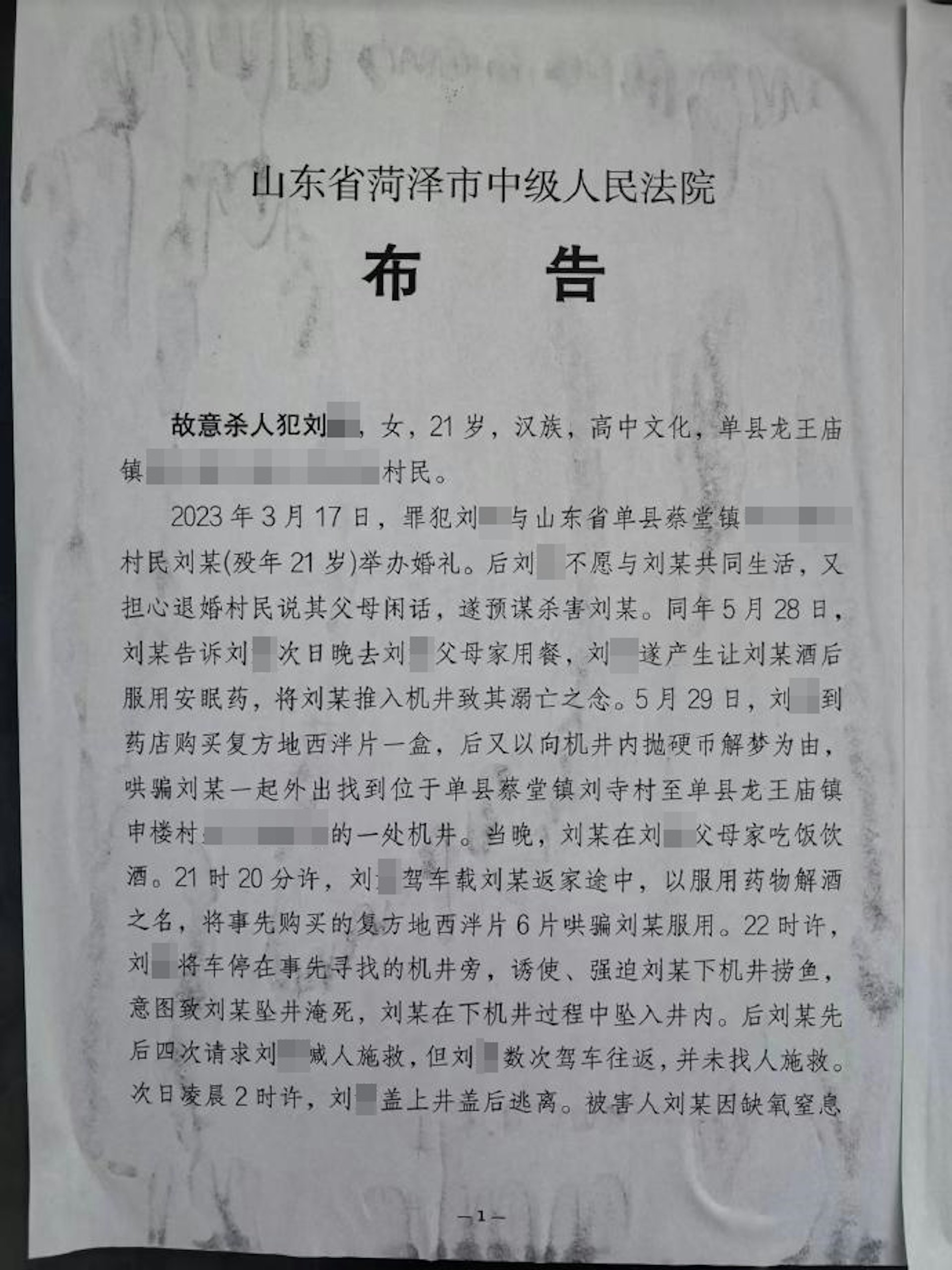 ศาลประชาชนระดับกลางเมืองเหอเจ๋อ มณฑลซานตง ประเทศจีน ได้มีคำพิพากษาประหารชีวิตหญิงสาวแซ่หลิว หลังจากก่อเหตุฆ่าสามีของตนเองเพียงสองเดือนหลังแต่งงาน โดยสาเหตุเกิดจากความไม่พอใจในชีวิตสมรสและความกลัวว่าจะถูกชาวบ้านซุบซิบนินทาหากหย่าร้าง เหตุสะเทือนขวัญนี้สิ้นสุดลงเมื่อวันที่ 26 กันยายน 2025 เมื่อศาลได้ดำเนินการประหารชีวิตตามกฎหมาย