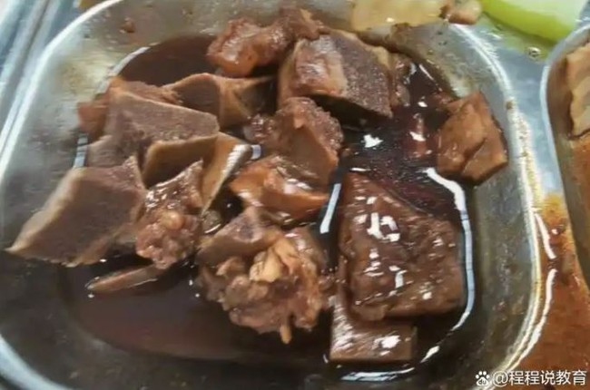 ในภาพมีเมนูที่ระบุว่า “ซี่โครงหมูตุ๋น” แต่เมื่อดูใกล้ ๆ กลับเห็นเกือบแต่กระดูกแทบไม่เหลือเนื้อให้กิน ผู้ปกครองจำนวนมากรู้สึกไม่พอใจและตั้งคำถามว่า “นี่มันปี 2025 แล้ว ทำไมเด็กในเซี่ยงไฮ้ยังต้องกินอาหารกลางวันแบบนี้อยู่?”