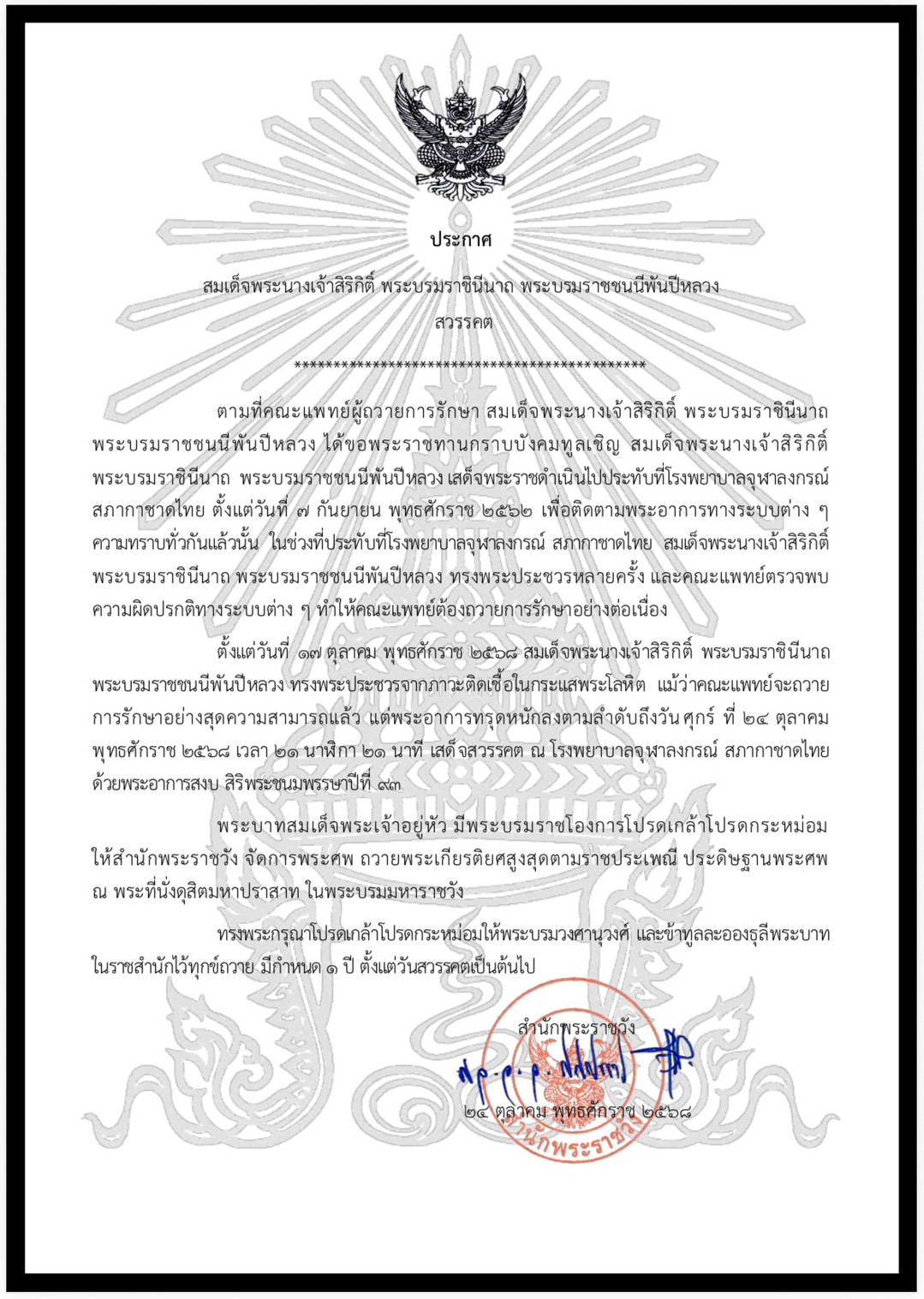 ตั้งแต่วันที่ 17 ตุลาคม พุทธศักราช 2568 สมเด็จพระนางเจ้าสิริกิติ์ พระบรมราชินีนาถ พระบรมราชชนนีพันปีหลวง ทรงพระประชวรจากภาวะติดเชื้อในกระแสพระโลหิต แม้ว่าคณะแพทย์จะถวายการรักษาอย่างสุดความสามารถแล้ว แต่พระอาการทรุดหนักลงตามลำดับ ถึงวันศุกร์ที่ 24 ตุลาคม พุทธศักราช 2568 เวลา 21 นาฬิกา 21 นาที เสด็จสวรรคต ณ โรงพยาบาลจุฬาลงกรณ์ สภากาชาดไทย ด้วยพระอาการสงบ สิริพระชนมพรรษาปีที่ 93