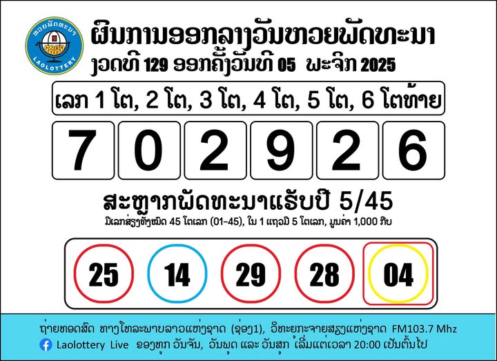 รายงานผลหวยลาว 5 พฤศจิกายน 2568 (5/11/68) ผลหวยลาว 6 ตัวออกรางวัลดังนี้