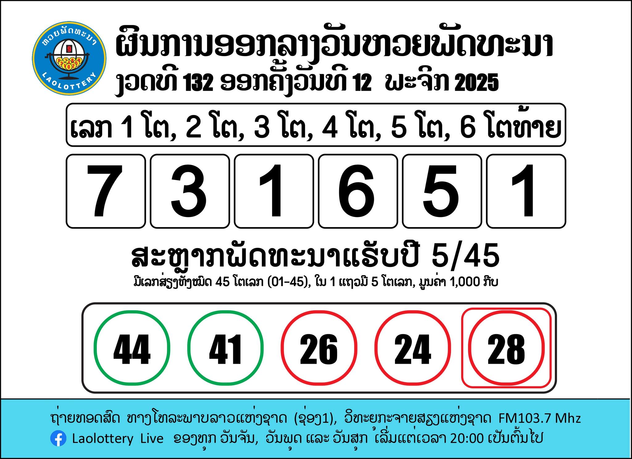 ผลสลากพัฒนาหวยลาว 5/45 งวดวันที่ 12 พฤศจิกายน 2568