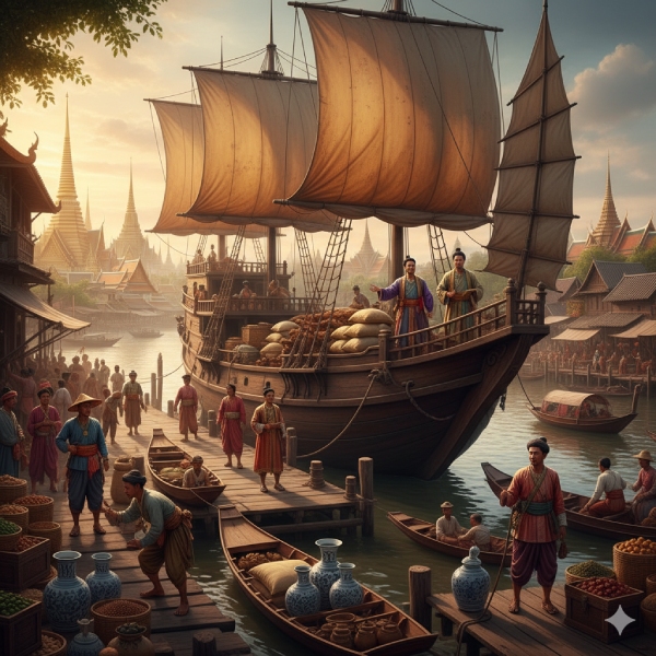 การค้ากับต่างประเทศ โดยเฉพาะจีน เป็นช่องทางหลักในการสร้างความมั่งคั่งให้กับราชสำนักและกลุ่มพ่อค้าชาวจีนโพ้นทะเลที่อพยพเข้ามาตั้งถิ่นฐานในสยามช่วงรัชกาลที่ 1–3 (ข้อมูลจากหอจดหมายเหตุแห่งชาติ)