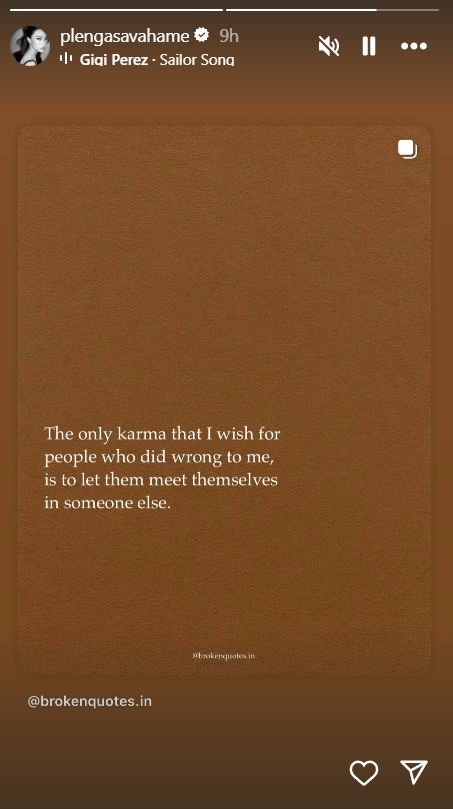 ล่าสุด (14 พ.ย. 68) เพลง โพสต์สตอรี่ปริศนา เป็นข้อความภาษาอังกฤษว่า “The only karma that I wish for people who did wrong to me, is to let them meet themselves in someone else.” ซึ่งแปลได้ว่า “กรรมเดียวที่ฉันหวังสำหรับคนที่ทำไม่ดีกับฉัน คือขอให้พวกเขาได้เจอคนแบบเดียวกับตัวเอง” ทำให้หลายคนจับตา ว่าข้อความดังกล่าวอาจหมายถึงความสัมพันธ์ที่เพิ่งยุติลงหรือไม่