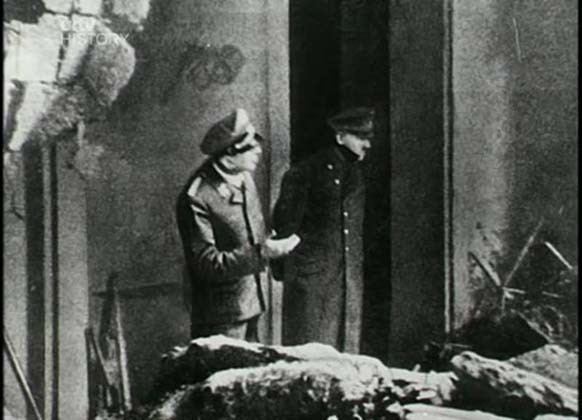 ภาพถูกถ่ายราว 2 วันก่อนเสียชีวิต ขณะยืนอยู่นอกหลุมหลบภัยในเบอร์ลิน ตรวจสอบความเสียหายจากระเบิด ฮิตเลอร์เสียชีวิตเมื่อวันที่ 30 เมษายน 1945