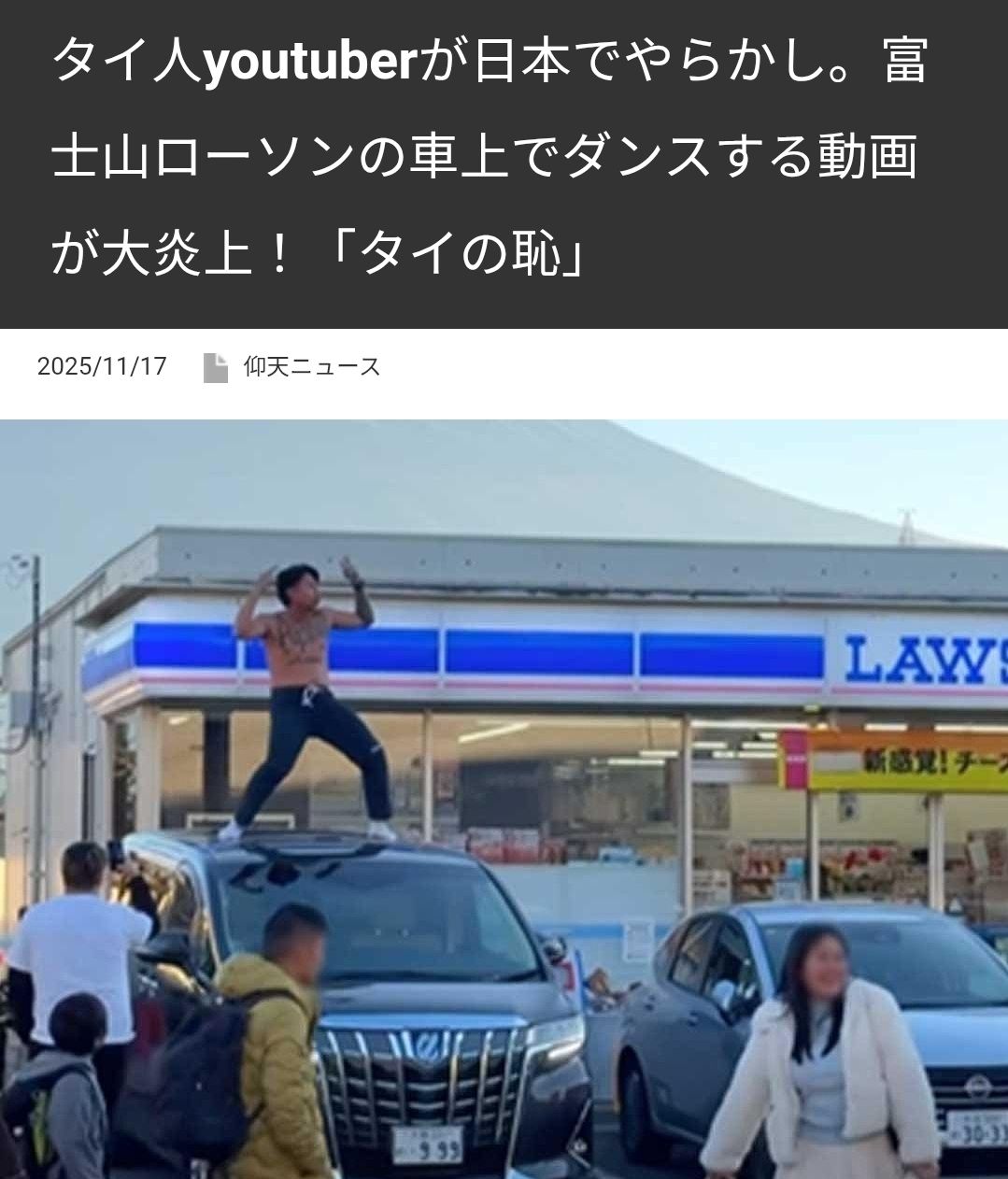 กลายเป็นประเด็นร้อนข้ามประเทศที่ถูกวิพากษ์วิจารณ์อย่างหนัก สำหรับกรณีของ YouTuber ชื่อดัง "แจ็ค แปปโฮ" หรือ จาตุรงค์ พาโพธิ์ ที่ทำคอนเทนต์ปีนขึ้นไปเต้นถอดเสื้อบนหลังคารถยนต์ บริเวณหน้าร้าน Lawson สาขาคาวากุจิโกะ ซึ่งเป็นจุดถ่ายรูปยอดฮิตที่มีฉากหลังเป็นภูเขาไฟฟูจิ พฤติกรรมดังกล่าวไม่เพียงแต่สร้างความไม่พอใจให้กับชาวเน็ต แต่ยังเสี่ยงต่อการถูกดำเนินคดีตามกฎหมายญี่ปุ่นที่มีความละเอียดอ่อนและเข้มงวด