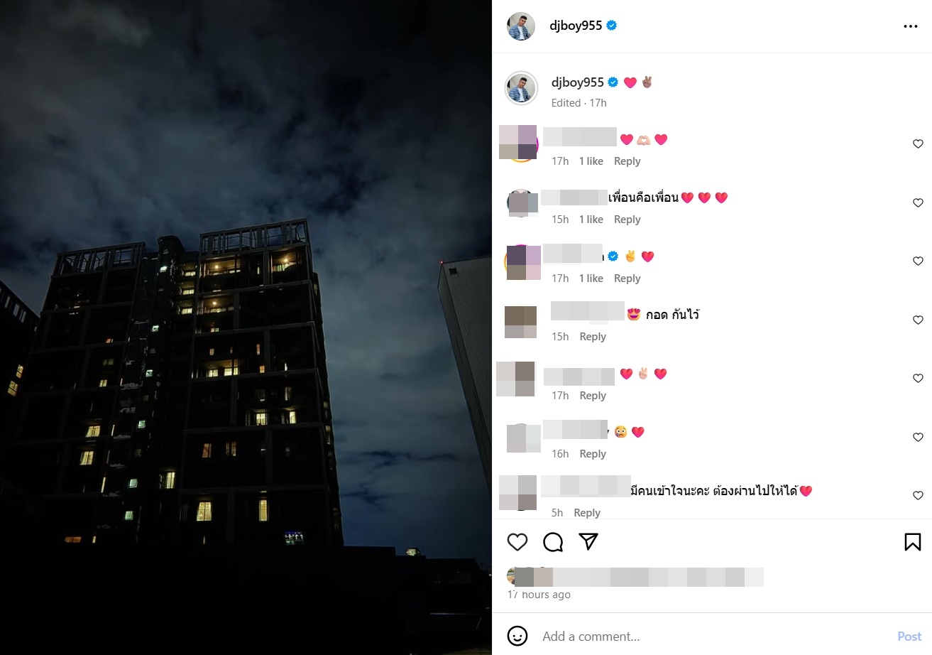 โดยล่าสุดในอินสตาแกรมของ ดีเจบอย ที่ได้เคลื่อนไหว ออกมาโพสต์ภาพตึกและแสงยามค่ำคืน พร้อมกับแคปชั่นที่เป็นอีโมจิหัวใจสีแดง และชูสองนิ้วสู้ๆ