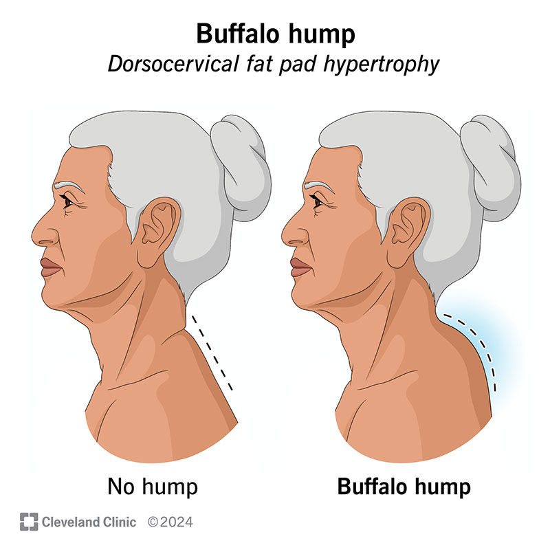 ลักษณะ "Buffalo Hump" คือไขมันที่สะสมเป็นปื้นนูนบริเวณหลังคอและไหล่ด้านหลัง แม้ว่าอาการนี้จะเป็นตัวบ่งชี้ทั่วไปของ Cushing's Syndrome ซึ่งเกิดจากฮอร์โมนคอร์ติซอลสูง แต่ก็มีความเชื่อมโยงกับเบาหวาน ระดับคอร์ติซอลที่สูงขึ้นอย่างต่อเนื่องอาจเป็นผลมาจากระดับน้ำตาลในเลือดที่สูงเป็นเวลานาน ซึ่งกระตุ้นให้ร่างกายสะสมไขมันในบริเวณนี้เป็นพิเศษ