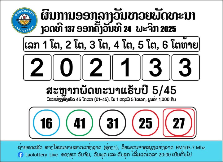 รายงานผลหวยลาว 24 พฤศจิกายน 2568 (24/11/68) ผลหวยลาว 6 ตัวออกรางวัลดังนี้