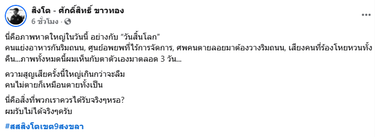 สส.สงขลา เผยภาพความโกลาหลที่ได้เห็นกับตาตัวเองมาตลอด 3 วัน โดยระบุว่า มีภาพของประชาชนต้อง "แย่งอาหารกันริมถนน" และศูนย์อพยพอยู่ในสภาพที่ "ไร้การจัดการ"