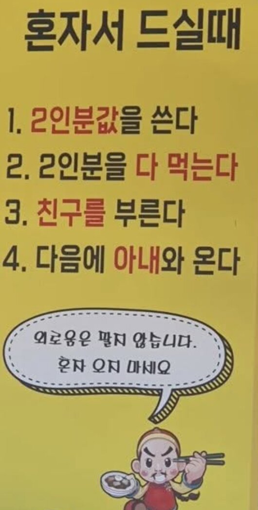 ร้านบะหมี่ในเมืองยอซู (Yeosu) กลายเป็นประเด็นร้อนในโลกออนไลน์ หลังจากติดโปสเตอร์ปฏิเสธลูกค้าที่มาคนเดียวอย่างโจ่งแจ้ง โดยโปสเตอร์ดังกล่าวมีตัวเลือกสำหรับลูกค้าที่มาคนเดียว 4 ข้อ คือ