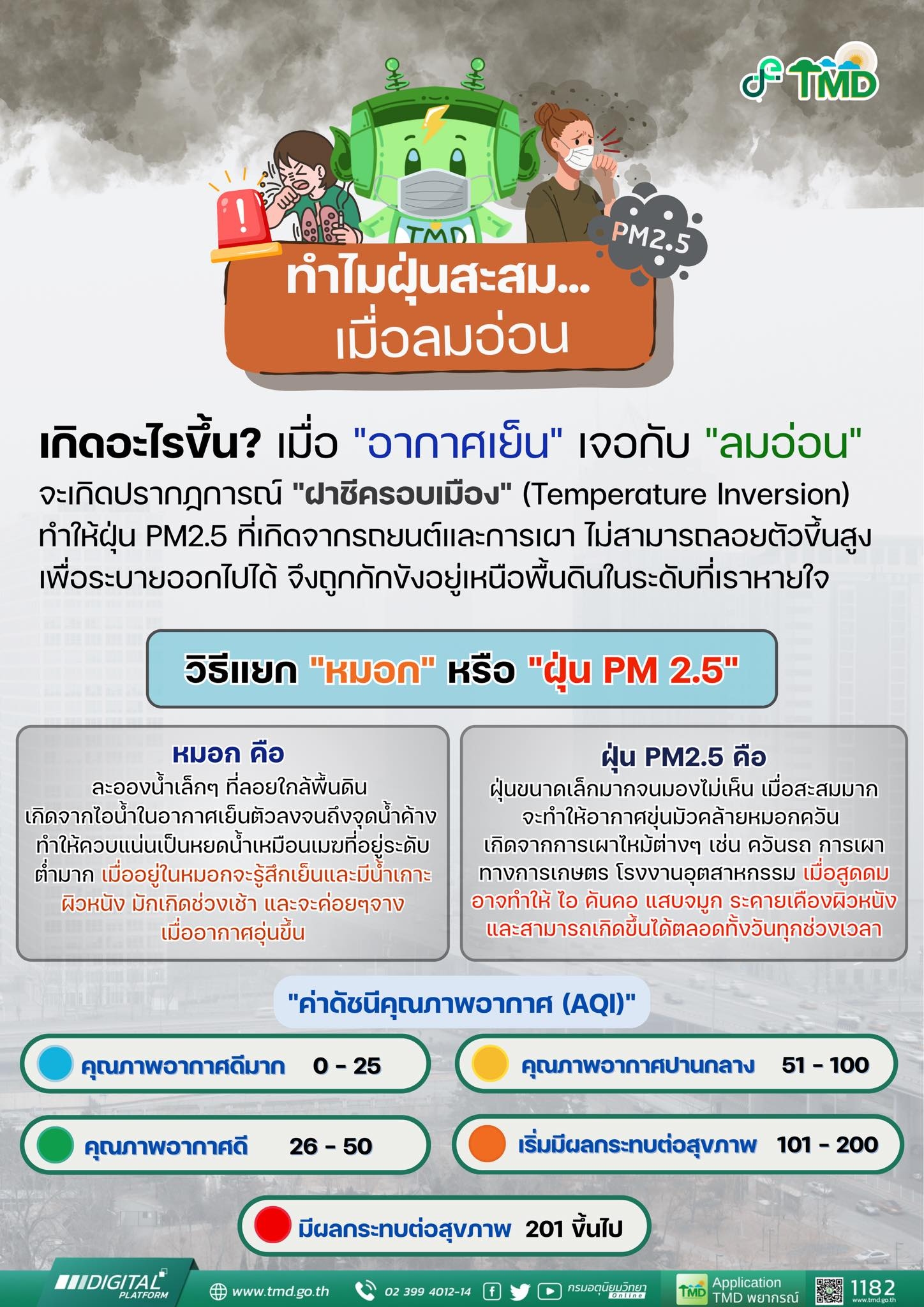 การรวมตัวของลมอ่อนและอากาศเย็นทำให้เกิดภาวะฝาชีครอบเมือง ฝุ่น PM2.5 จึงถูกกักอยู่ในระดับพื้นดิน ไม่สามารถกระจายตัวได้ ส่งผลให้ค่าฝุ่นพุ่งสูงอย่างเห็นได้ชัดในหลายพื้นที่ ผู้ที่อาศัยอยู่ในเขตเมืองจึงควรติดตามค่า PM2.5 ใกล้ชิด และป้องกันสุขภาพอย่างเหมาะสม