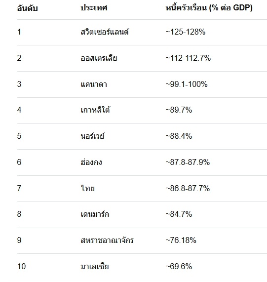 สถานการณ์หนี้ครัวเรือนทั่วโลกในปี 2025 กลายเป็นประเด็นที่ถูกจับตาอย่างใกล้ชิด หลังข้อมูลล่าสุดชี้ว่าหลายประเทศเศรษฐกิจก้าวหน้ามีสัดส่วนหนี้ครัวเรือนต่อจีดีพีอยู่ในระดับสูง เนื่องจากประชาชนเข้าถึงระบบสินเชื่อได้ง่าย ขณะที่ประเทศไทยถูกจัดให้อยู่ในกลุ่มประเทศที่มีหนี้ครัวเรือนสูงติดอันดับต้น ๆ ของโลก โดยทั้ง 10 อันดับ มีดังนี้