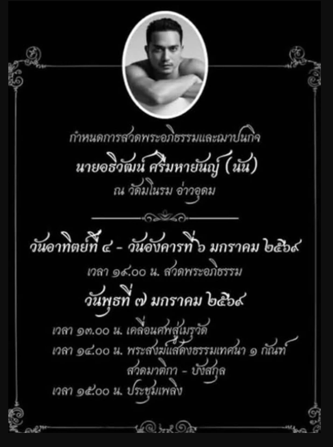โดยพิธีสวดพระอภิธรรมศพของ นัน อธิวัฒน์ จะจัดขึ้น ณ วัดมโนรม อ่าวอุดม อ.ศรีราชา จ.ชลบุรี ตามกำหนดการ